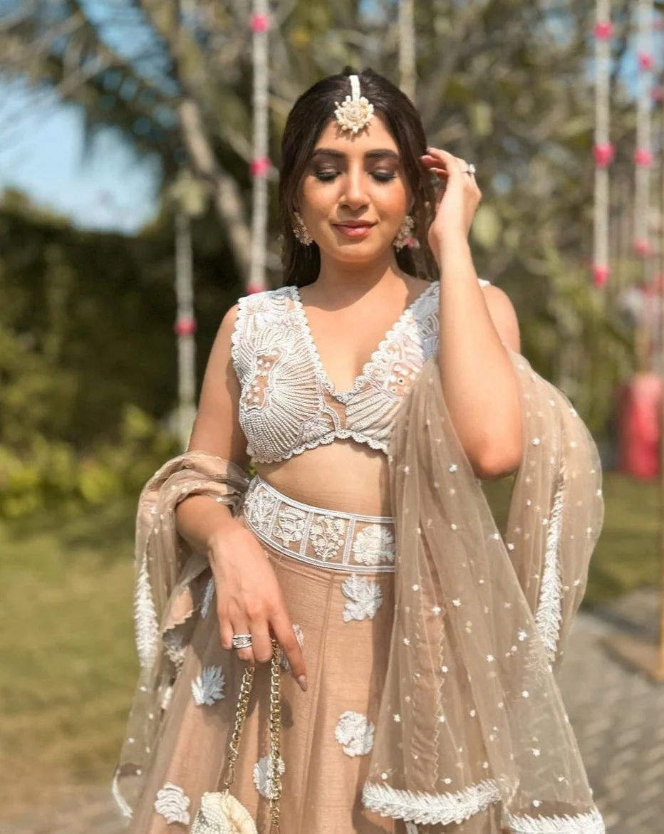 The Magnolia maangtika represents regality through its meticulously handcrafted design with the details of metal wire, pearls, sequins and stones.